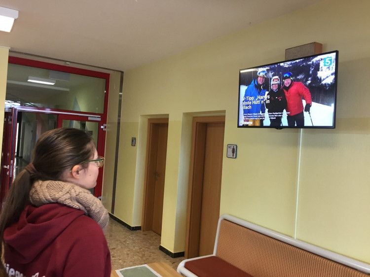 Monitore in der Aula, einer der beiden Monitore wird für Werbekunden bereitgestellt, der 2. Screen wird mit Schulinhalten bespielt.